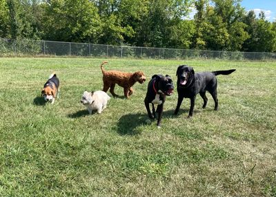Daycare is a great opportunity for exercise and socialization. Playtime is included in daycare rates. Dogs may participate in group or individual playtime in the two acre, fenced in play yard. Each dog will have access to their own, fully cleaned and sanitized kennel where they can eat, drink or rest. Every kennel is furnished with blankets/bedding and water/food bowls.